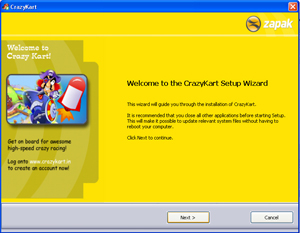 t follow the simple instructions in the program to install the game.You will also need an internet connection to play this game. (Thats most important!) First things first! Before you can start playing, you have to register an account for yourself. Just fill out the form online by going to http://secure.zapak.com/ckregister.php and choose your username and password. Question 1. How do I save my game? You cannot save your game in CrazyKart. Your character, level, karts, accessories and all your progress are saved on the server. ![]()